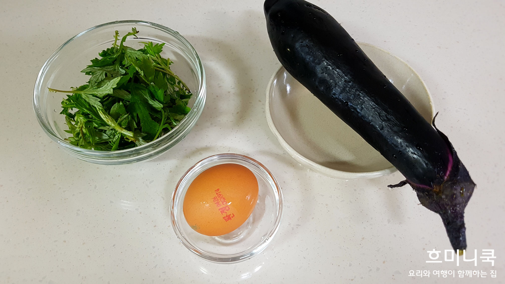 가지 1개, 쑥, 계란 1개,